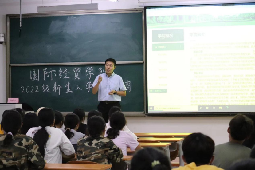 副院长刘伟全老师,院长助理王磊老师、国际商务教研室王涛老师、李大凯老师,于9月26日晚在圣井校区6号楼为全体新生举办入学专业教育讲座。