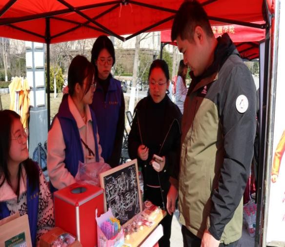 善意流转暖人心,志愿践行显担当。在手工义卖区,热闹氛围丝毫不减,由济南市乐橄儿智障人士服务中心的自闭症儿童手工制作的牛轧糖、特色酸奶等精致手工艺品整齐陈列,凭借新颖的样式和纯正的口感,吸引了众多师生驻足选购、奉献爱心。志愿者们热情地向师生介绍,细致讲解此次义卖所得将全部捐赠给济南市乐橄儿智障人士服务中心,为他们提供托管、康复训练等服务,助力其提升生活自理能力。每一次咨询、每一笔成交,都是一次爱心的传递、一份善意的凝聚,生动诠释了“雷锋精神,人人可学;奉献爱心,处处可为”的深刻内涵,让善意在春日校园里流光溢彩。