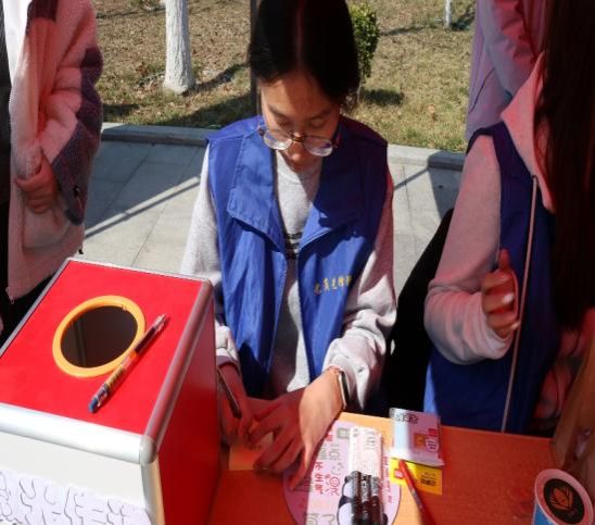 此外,“小蓝贸”志愿服务队还设置了知识普及与温情留言环节,通过雷锋知识问答、趣味互动等形式,向师生普及雷锋事迹与精神内涵,引导大家深入理解新时代雷锋精神的时代价值;温情留言板上,一句句真挚的话语、一个个坚定的承诺,承载着师生们对雷锋精神的崇敬与传承之志,成为游园会上一道温情的风景线。