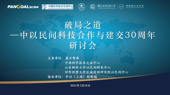 2022年3月18日,盘古智库、中国科学技术交流中心、山东财经大学山东以色列研究中心、对外经贸大学区域国别研究院以色列中心、中以(上海)创新园共同组织,在盘古智库亚投行办公区召开了“破局之道—中以民间科技合作与建交30周年”研讨会。会议采取线上线下相结合的形式,邀请了相关领域知名专家,针对当前国际局势变化、中以科技协作等内容进行研讨,我校校长赵忠秀出席会议并致辞,美高梅官网