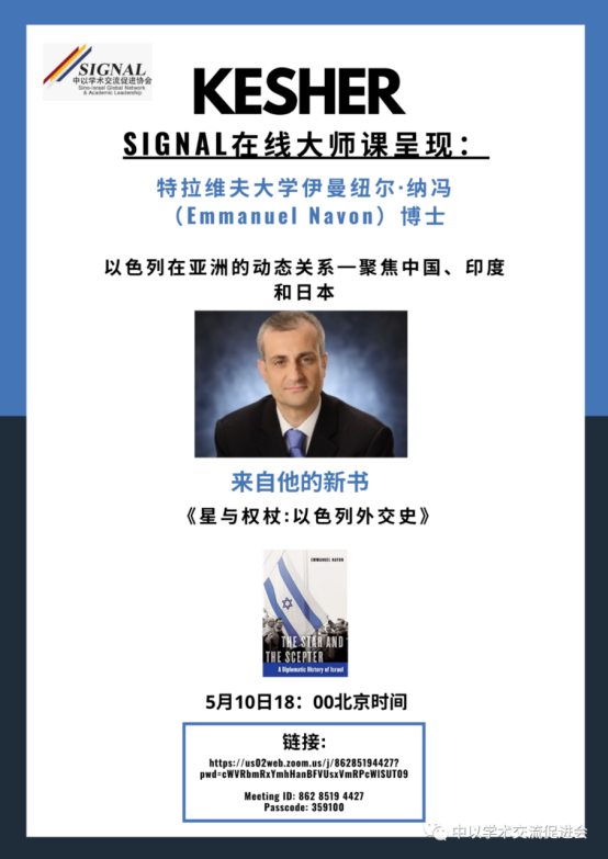 2021年5月10日,北京时间18:00,由中以学术交流促进协会(SIGNAL)组织的在线大师课顺利举办,此次课程主讲是来自特拉维夫大学的伊曼纽尔·纳冯(Emmanuel Navon)博士,其讲座主题为“以色列在亚洲的动态关系——聚焦中国、印度和日本”。我校国际发展合作创新实验班的同学们按时参加了本次在线课程的学习。